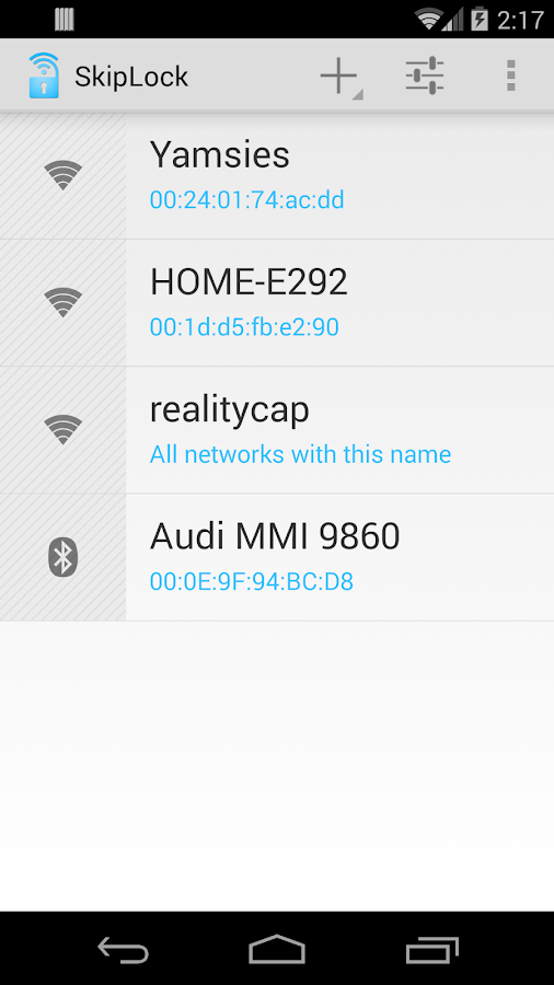 Tired of entering your secret word constantly? Skiplock gives you a chance to skip past the lock screen when youre associated with a designated wifi or bluetooth gadget. When youre at home or in your auto, your telephone is sheltered and you dont have to be writing in your watchword constantly. When youre joined with your wifi system, or a trusted bluetooth gadget, you can go straight to the home screen when you press the force catch. You can even have it keep the telephone opened while youre joined with a bluetooth keychain, headset, or auto. When the telephone escapes range, it bolts.
